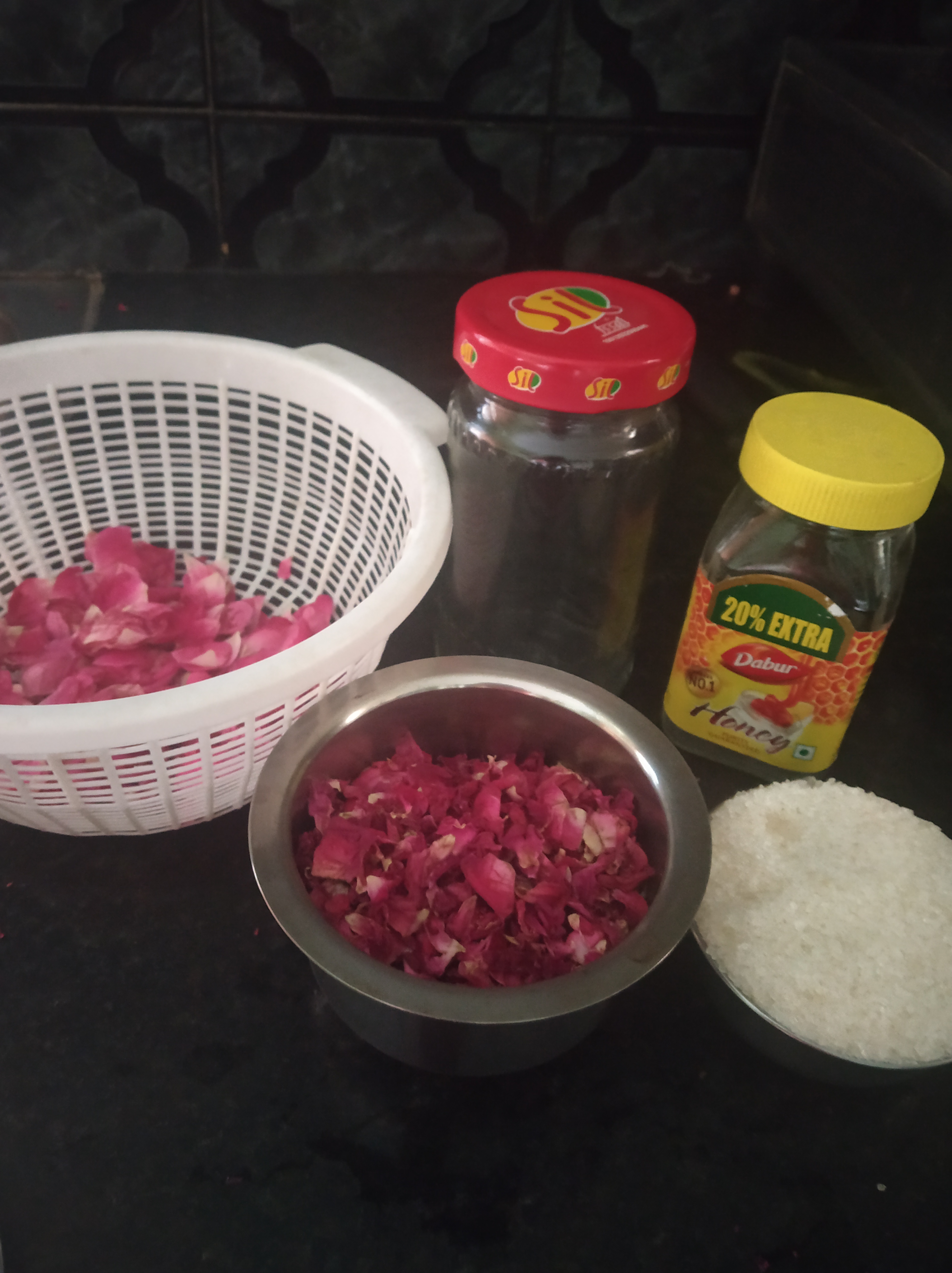 Recently I tried to prepare ” GULKAND” ~ a sweet rose petal preserve (Jam/Gelly in local language)at home, which is really delicious, commonly known for its calming & soothing effect on body as well as mind due to it’s sheet virya(cooling property)